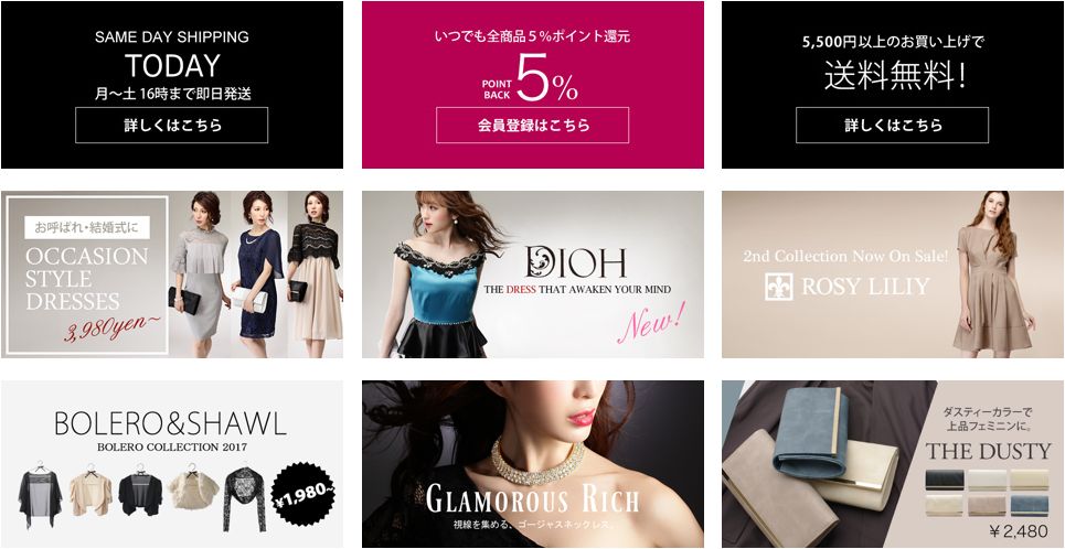 激安のドレスから可愛いドレスだけでなく、スーツやパンプスなど大人女子にはもってこいです。